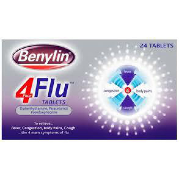 Relief of symptoms associated with colds and flu including cough, fever, headache, muscular aches and pains and congestion.